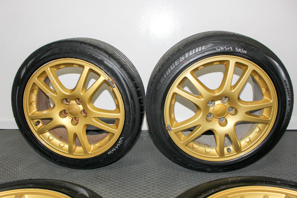 Keywords: JDM STI Enkei wheels for sale, Subaru 5×100 gold wheels, WRX STI Version 7 rims, 17×7.5 Subaru wheels Brembo fit, Subaru GD Enkei wheels OEM