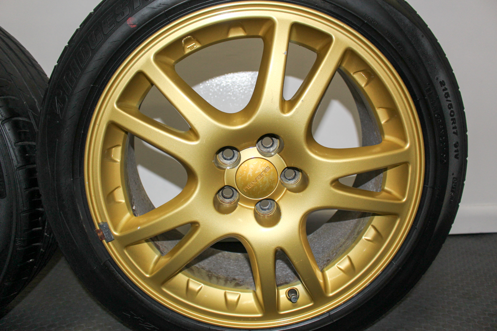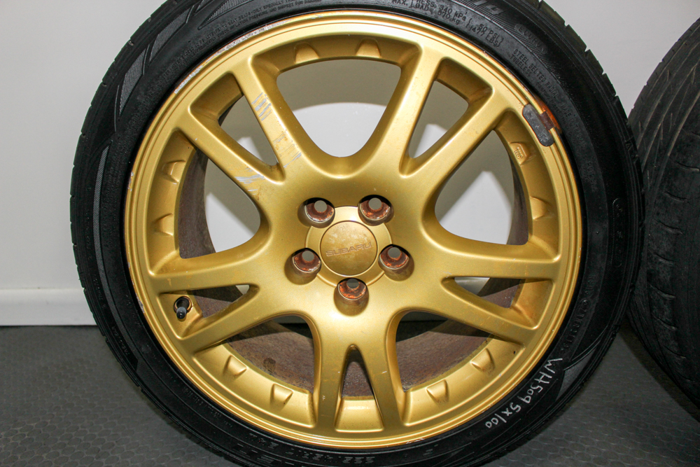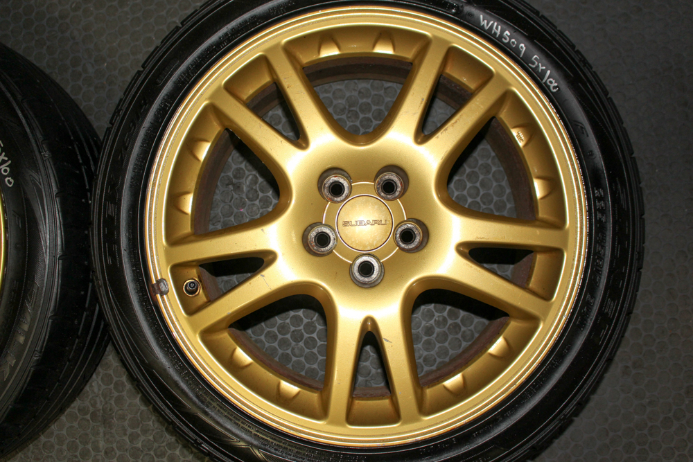 OEM Subaru WRX STI Version 7 gold wheels 17×7.5 +48 with Brembo clearance. Set of four 10-spoke rims available at J-Spec Auto Sports.